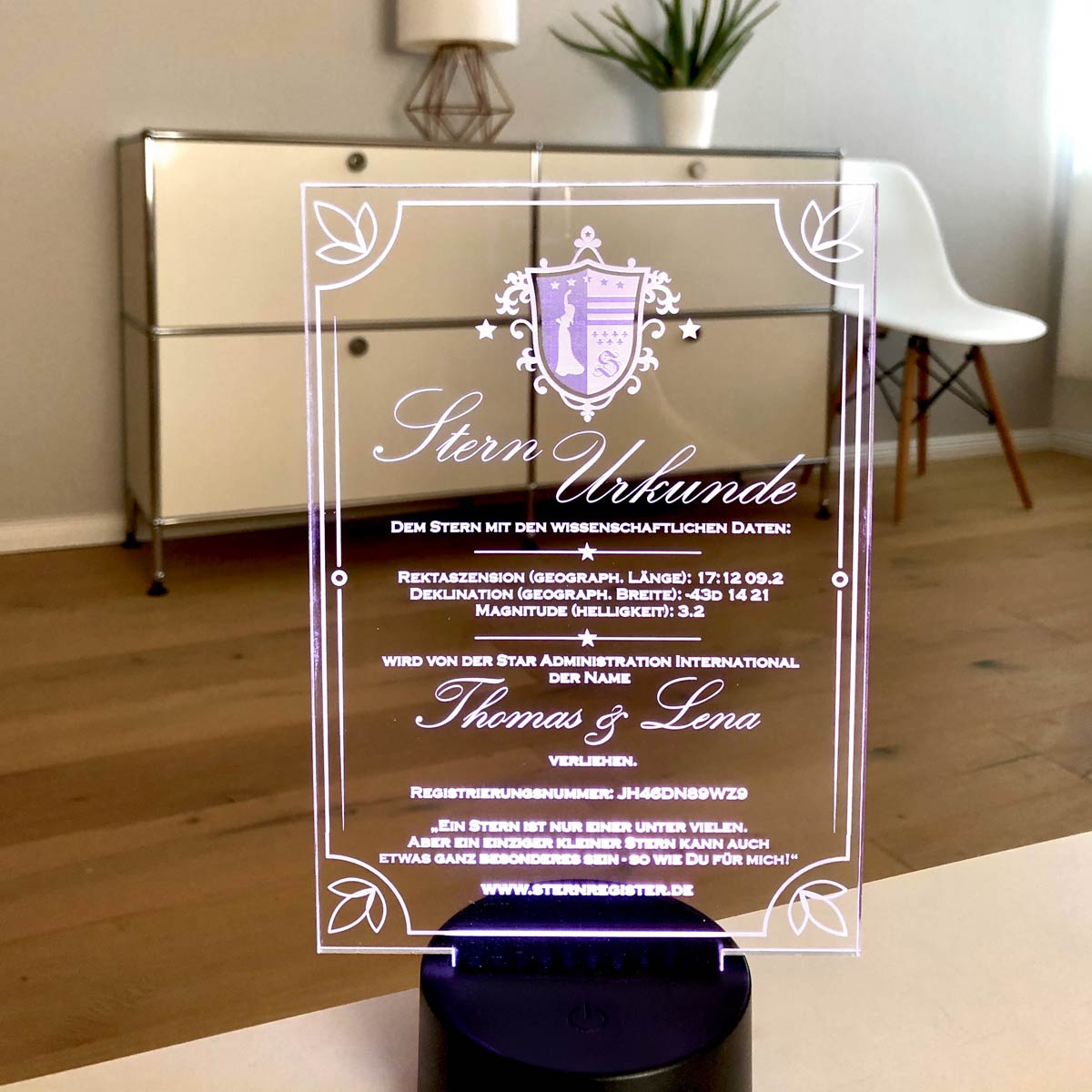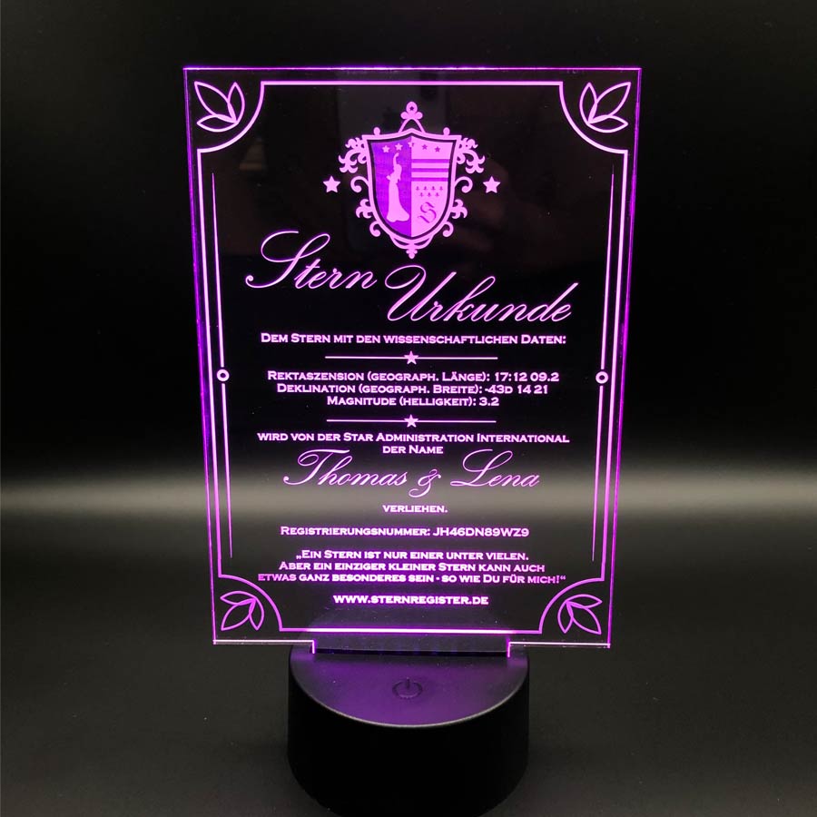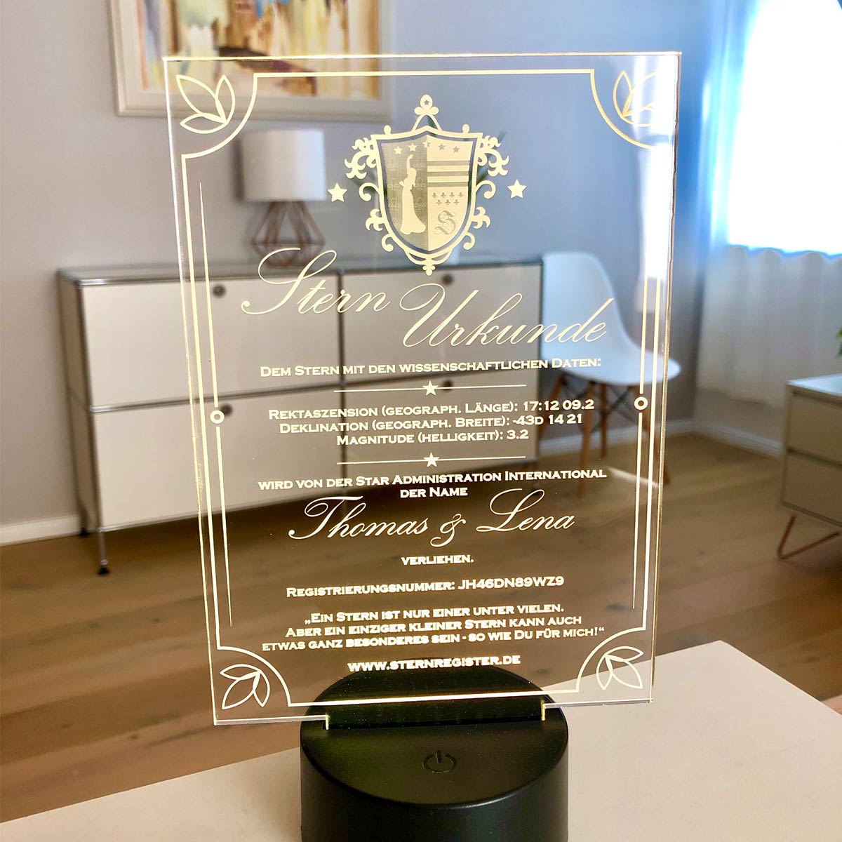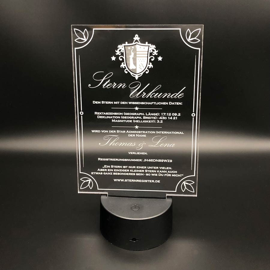 Ihre Sterntaufe-Urkunde in Acrylglas graviert, inkl. LED Leuchtsockel mit Fernbedienung