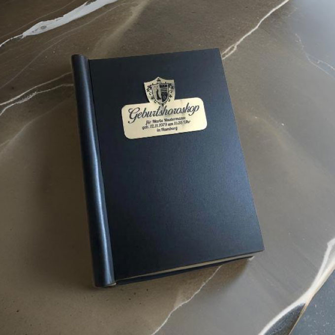 Ihr persönliches Geburtshoroskop wird für Sie in einem edlen Hardcover-Buch mit festem Einband mit Ledernarbung gebunden. Den Einband schmückt ein goldenes Emblem mit dem Namen des Horoskopinhabers.