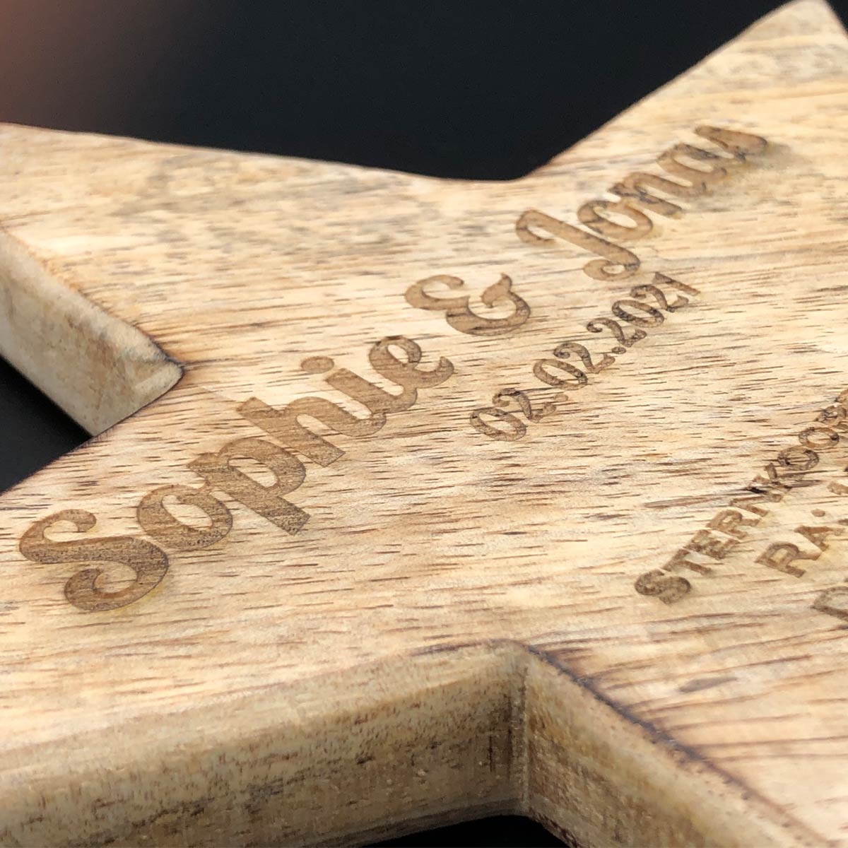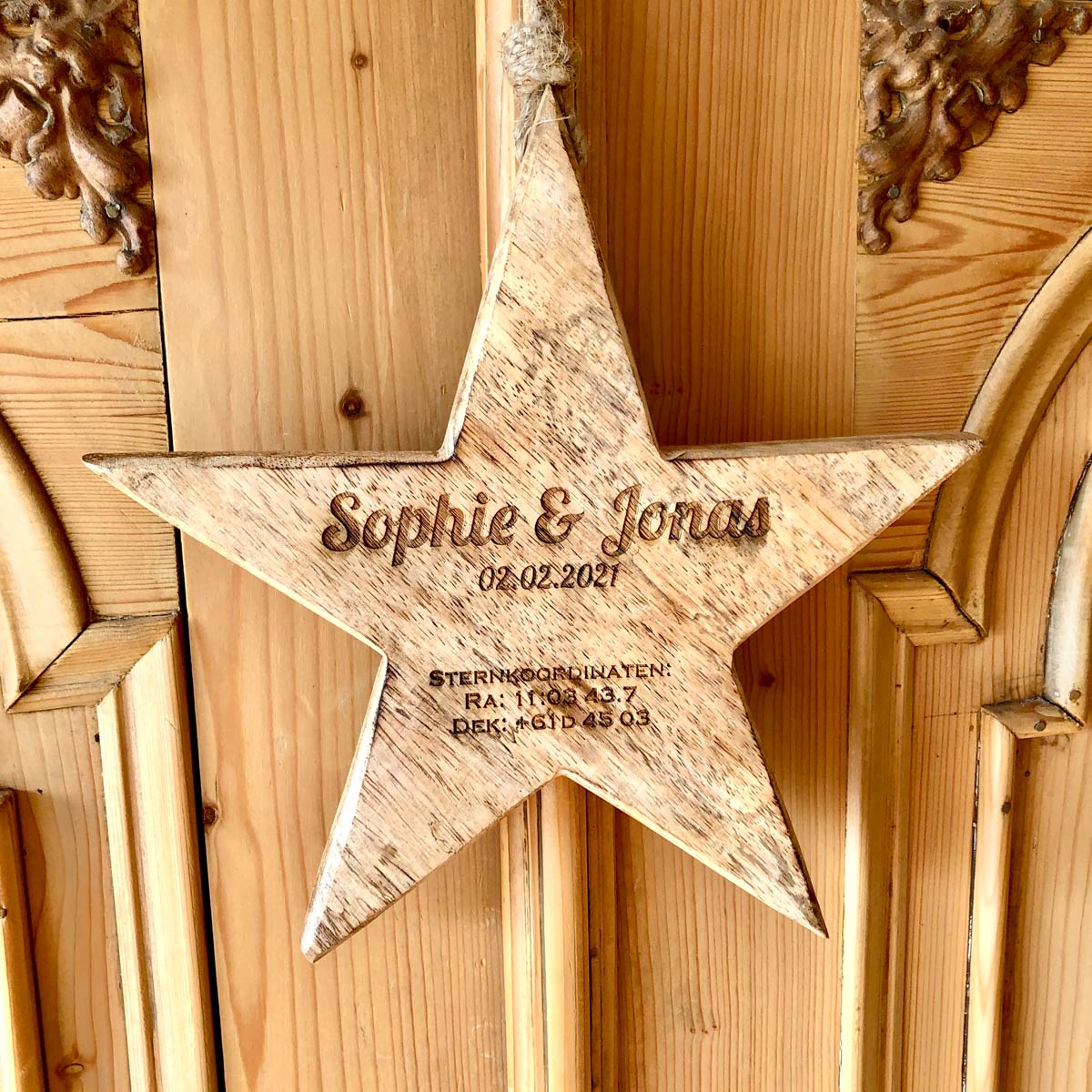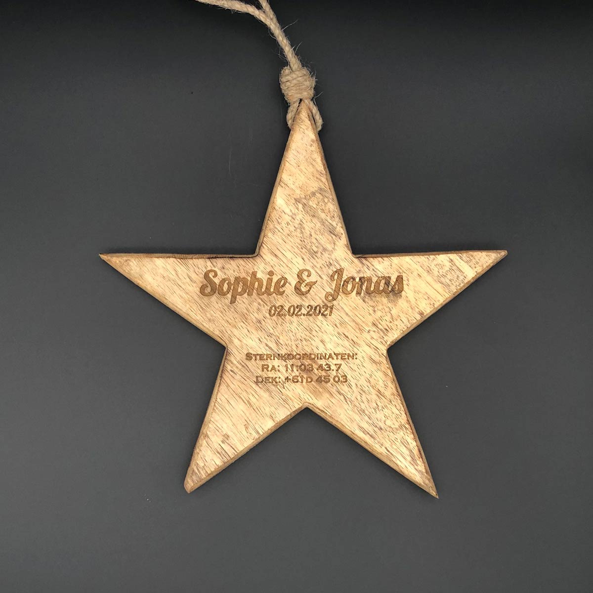 Großer Stern aus echtem Mangoholz, inkl. Gravur Ihrer Sterndaten