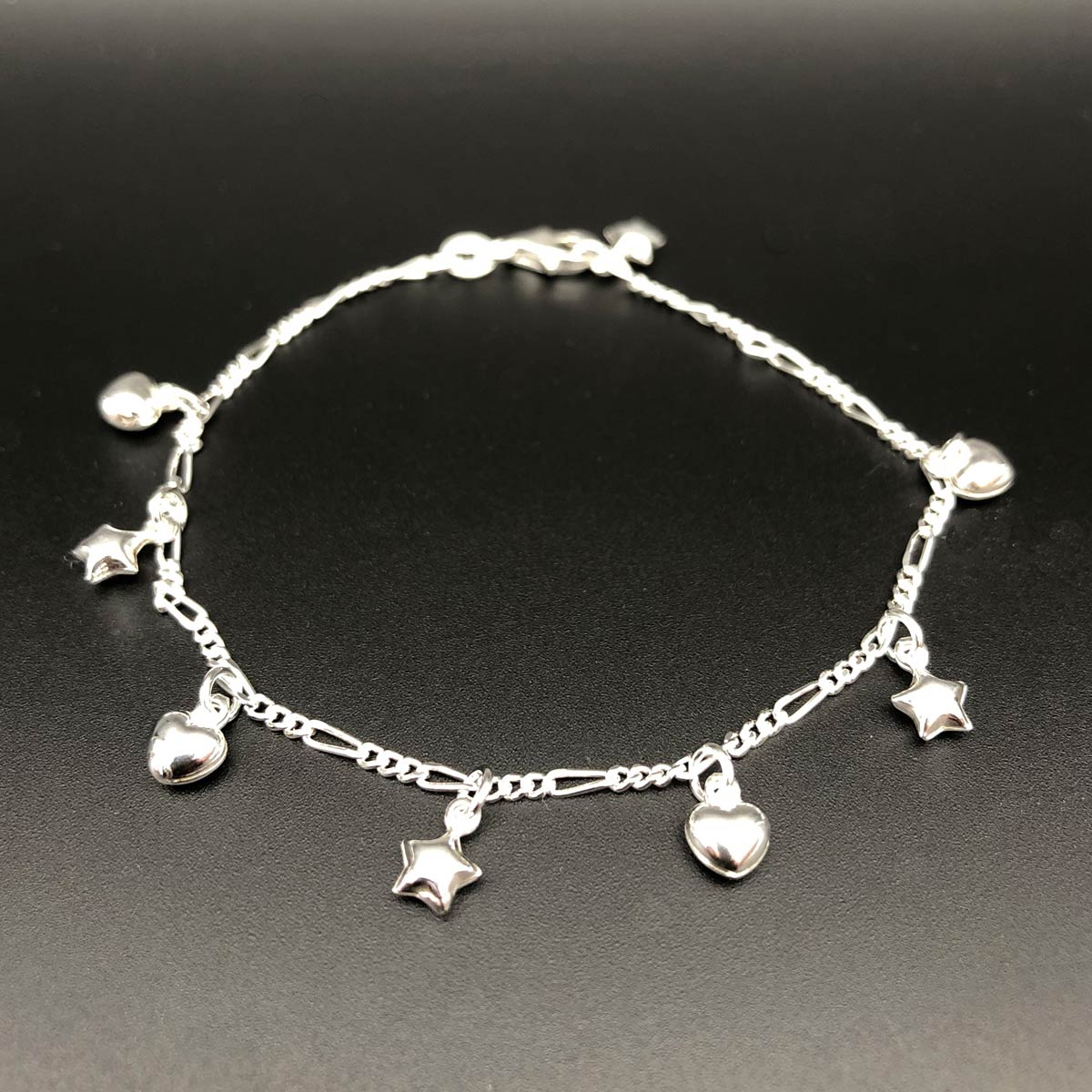 Das schlichte, aber wunderschöne Figaroarmband aus Silber Silber 925/000 ist mit mehreren Stern- und Herzanhängern aus Silber ausgestattet.