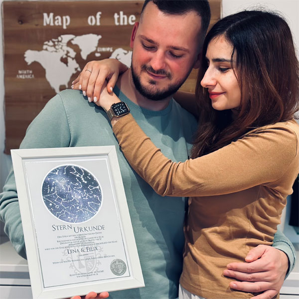 Die Sternurkunde ist das Herzstück der Sterntaufe: Sie dokumentiert ihren persönlichen Eintrag in das internationale S.A.I.-Sternregister®. Neben dem von Ihnen gewählten Sternnamen und dem Taufdatum sind auch die wissenschaftlichen Daten und Koordinaten Ihres Sterns auf der Urkunde angegeben. Optional können Sie Ihrer Sternurkunde auch eine persönliche Widmung hinzufügen – natürlich kostenlos.