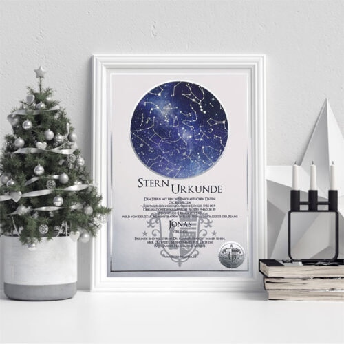 Die Sternurkunde ist das Herzstück der Sterntaufe: Sie dokumentiert ihren persönlichen Eintrag in das internationale S.A.I.-Sternregister®. Neben dem von Ihnen gewählten Sternnamen und dem Taufdatum sind auch die wissenschaftlichen Daten und Koordinaten Ihres Sterns auf der Urkunde angegeben. Optional können Sie Ihrer Sternurkunde auch eine persönliche Widmung hinzufügen – natürlich kostenlos.