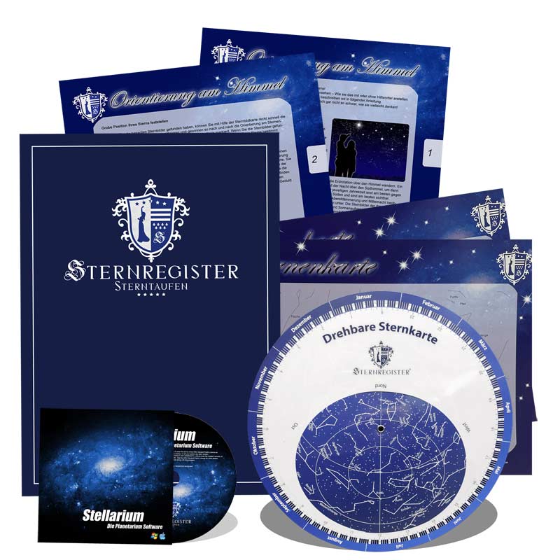 Mit der professionellen Software „Stellarium“ erhalten Sie ein vollwertiges Planetarium für Ihren PC, mit dem Sie den Sternenhimmel zu einem beliebig einstellbaren Zeitpunkt von Ihrem heimischen Computer betrachten können. Auch Ihren eigenen Stern können Sie sich mit der Software anzeigen lassen und sich am Sternenhimmel auf Erkundungstour begeben. Die Software erhalten Sie auf CD-Rom für PC und MAC.