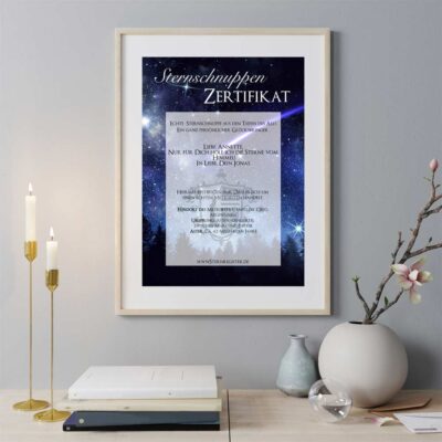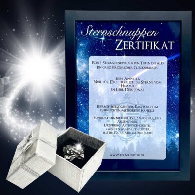 Mit dem Kauf Ihres Sternschnuppen-Pakets erhalten Sie ein dekoratives Zertifikat mit persönlicher Widmung, mit dem wir Ihnen die Echtheit Ihres Meteoriten bestätigen. Mit einer persönlichen Widmung , die sie entweder aus unseren Vorlagen wählen oder aber selber formulieren können, können Sie direkt auf dem Zertifikat ein paar liebe Worte an den Beschenkten richten.